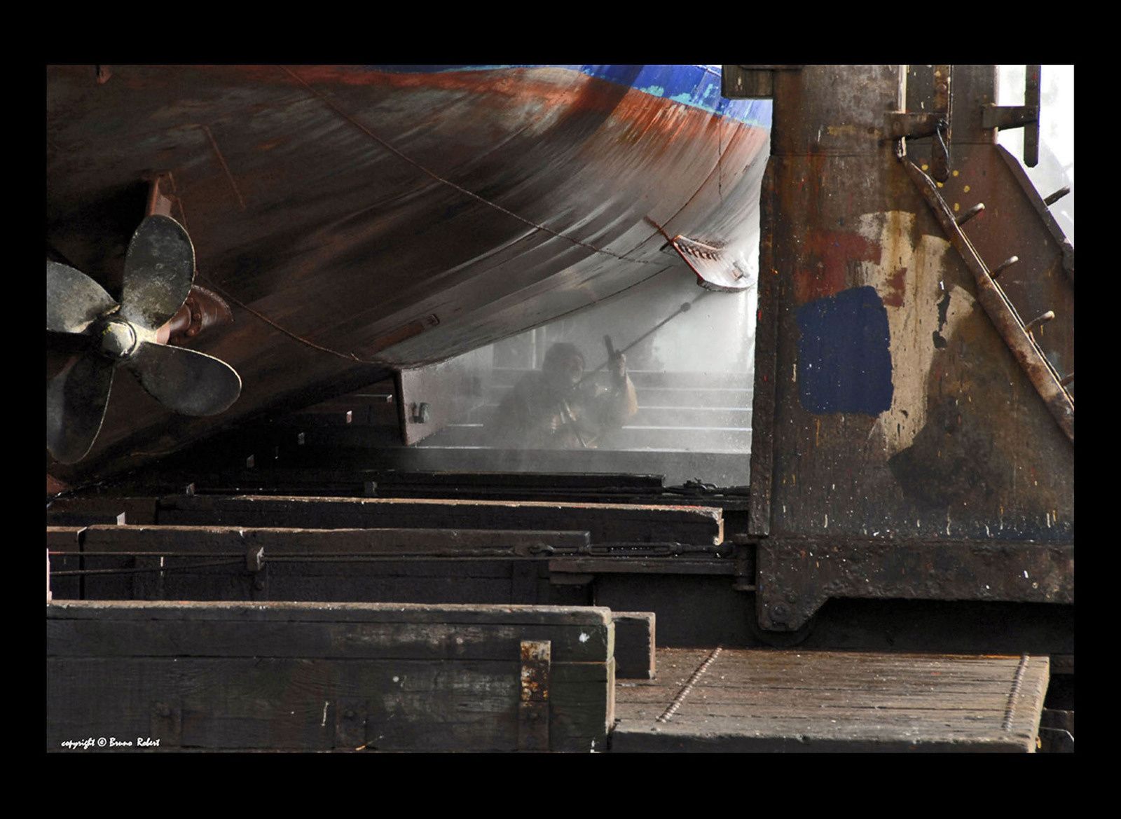 Ma candidature au Salon de la Marine 2014 a été acceptée. Ainsi, je vais exposer au Musée National de la Marine, situé Place du Trocadéro à Paris, ma photographie de "L'homme, au carénage", réalisée entre les bers du "slipway" du chantier naval, aujourd'hui disparu, du Bassin Bouvet à Saint-Servan. Ce qui représente pour moi un grand honneur, dont je remercie les Membres du Jury du 43ème Salon de la Marine. Dès que je connaîtrai les dates dudit Salon, je vous les communiquerai. Bises et amitiés, Bruno